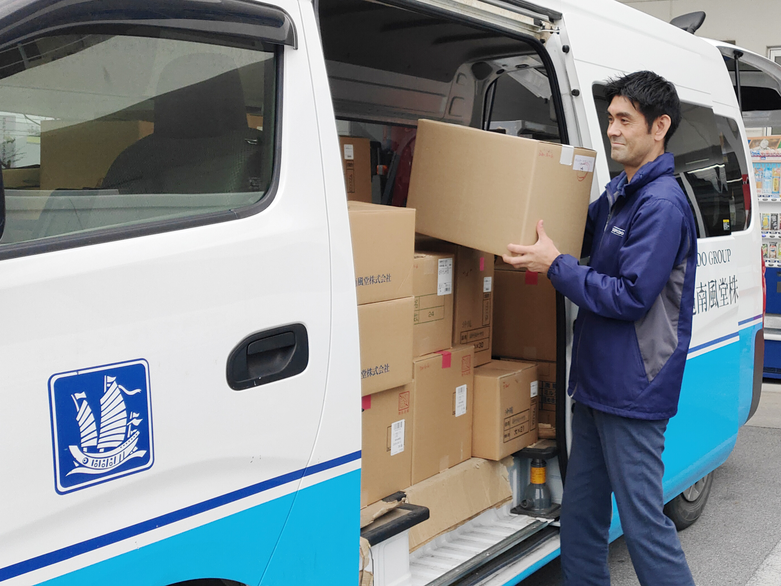 南風堂で製造されたお菓子を県内各地の取引先へ届ける配送業務です。